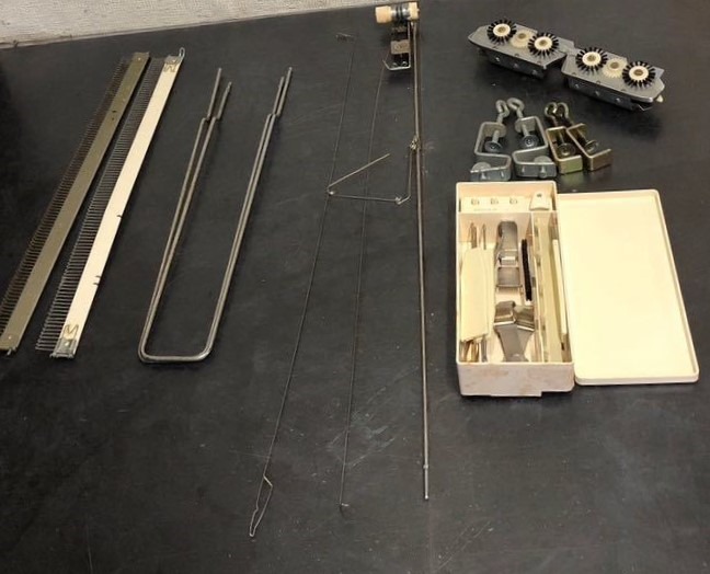 Major assesories included are extension rails, yarn mast, detachable row counter, sinker plate, lace carriage and cast-on combs.