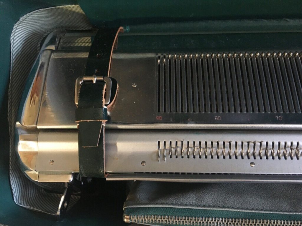 The carriage has a tension dial, row counter tripper (needs to be pulled out), yarn feeder (looks like for just one thread) and holding cam levers. The handle is on the left-hand side of the carriage (not seen very well in my pictures below but the manual shows it well). It looks like the sinker plate is removable, unlike earlier vintage models, like KH35. Refer to the manual to learn about all other functions of the carriage.