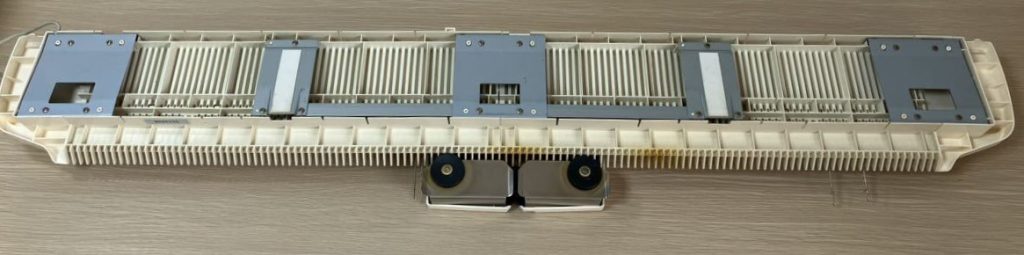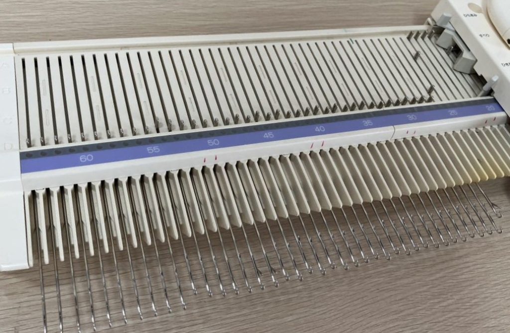 It is structured also similarly to other flatbed plastic knitting machines with the sections connected by metal plates. Thus, the needle bed can be extended (by adding additional plates) to more needles to knit wider panels (for example, blankets).