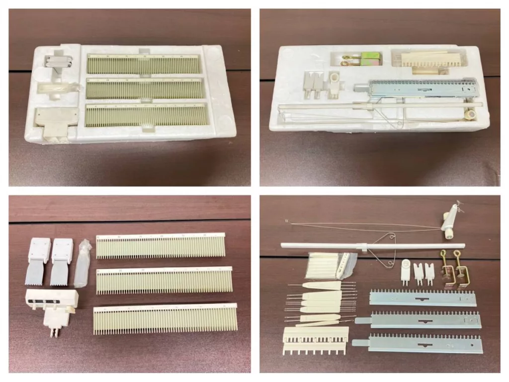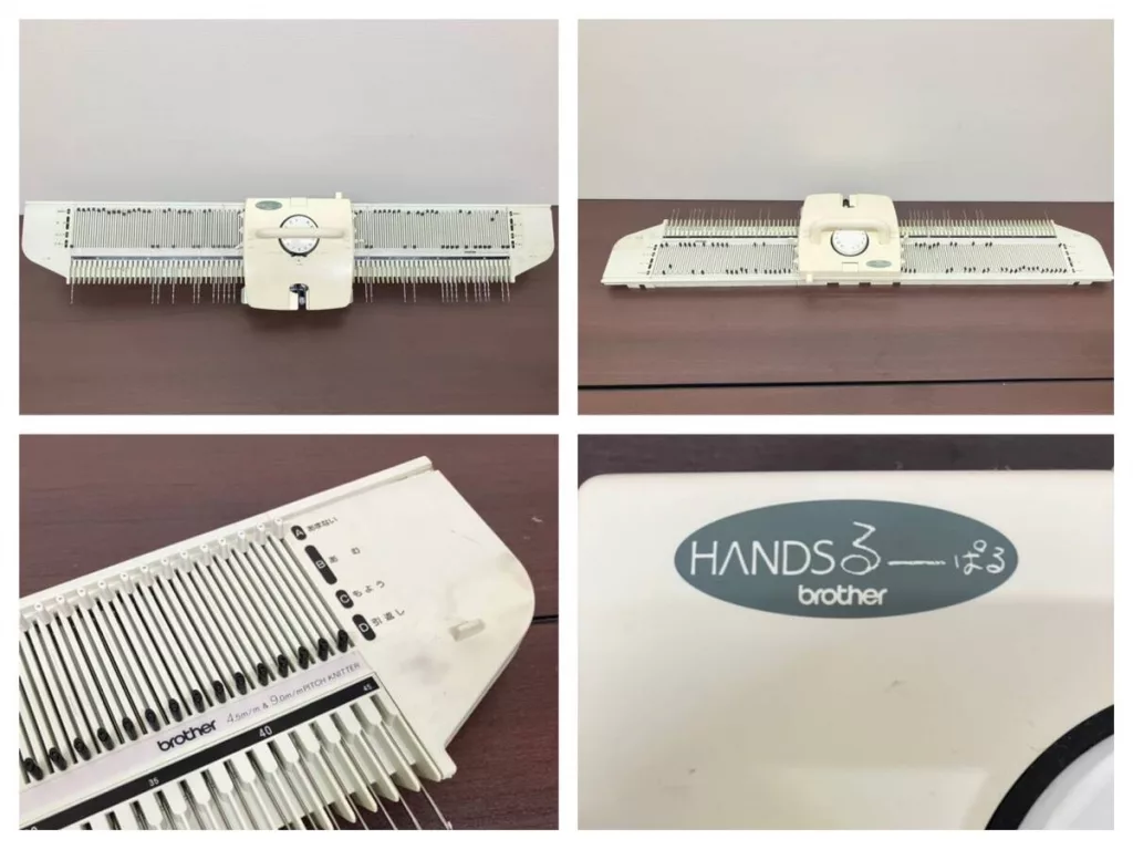 Brother KH365 is a plastic needlebed dual gauge knitting machine. It has exchangeable needlebed sections with the distances between grooves for needles either 4.5 mm or 9 mm. However, the needles are the same. I have not had a chance to work on a convertible dual-gauge machine like this, but I can imagine that despite has capabilities of a bulky-gauge machine, it is still limited to a range of yarns it can take due to the needle sizes being the same.