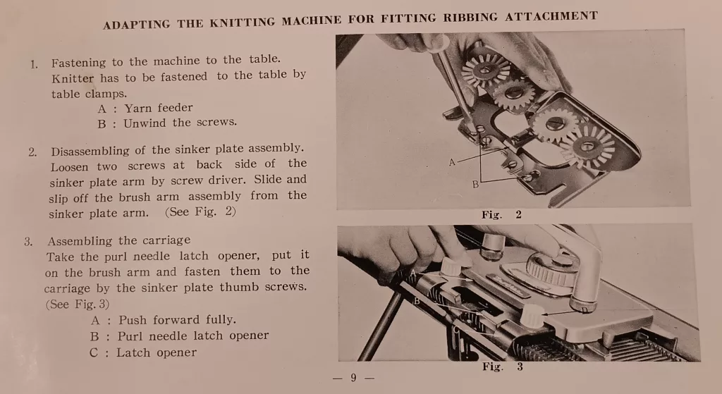 The Brother KH521 knitting machine can be matched with the Brother KR321 ribber. In fact, the KH521/KR321 setup is interesting. That inner section I was talking above about is removed and an attachment for the ribber is placed instead. Below is a picture from the manual of KR321.