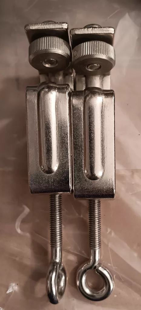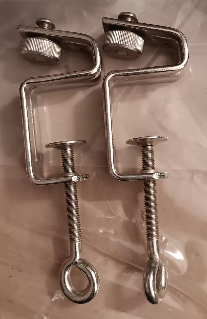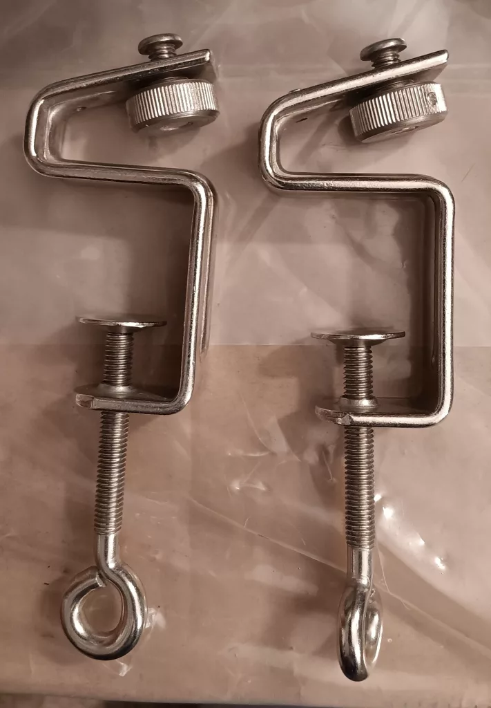 Brother KH521 comes with S-shaped table clamps, typical for early machines. Although any S-shaped clamps will work with just the machine, the original ones look like those shown below (slightly different from the table clamps for KH551).