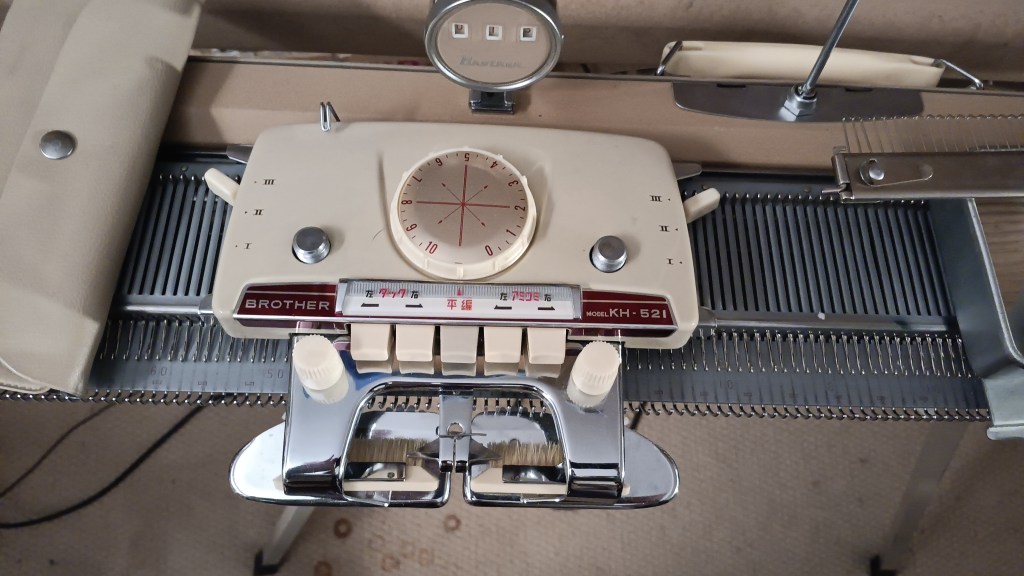 If you got the machine with the writing on the carriage in Japanese, refer to the manuals for KH531 and/or KH551 for details. As a quick reference: the two left-hand side buttons are “tuck”, the middle button is “plain” knitting or to reset the buttons, and the right-hand side buttons are “part” or “slip”.