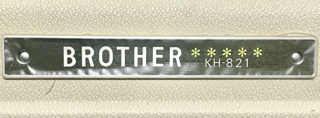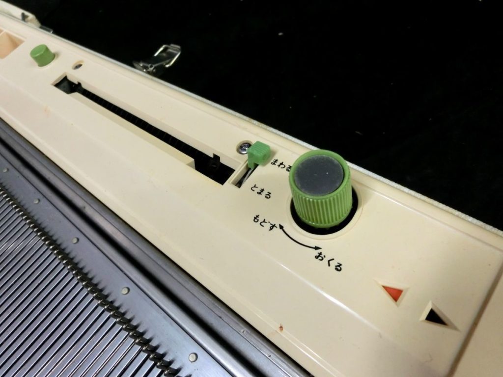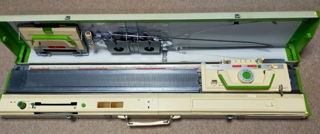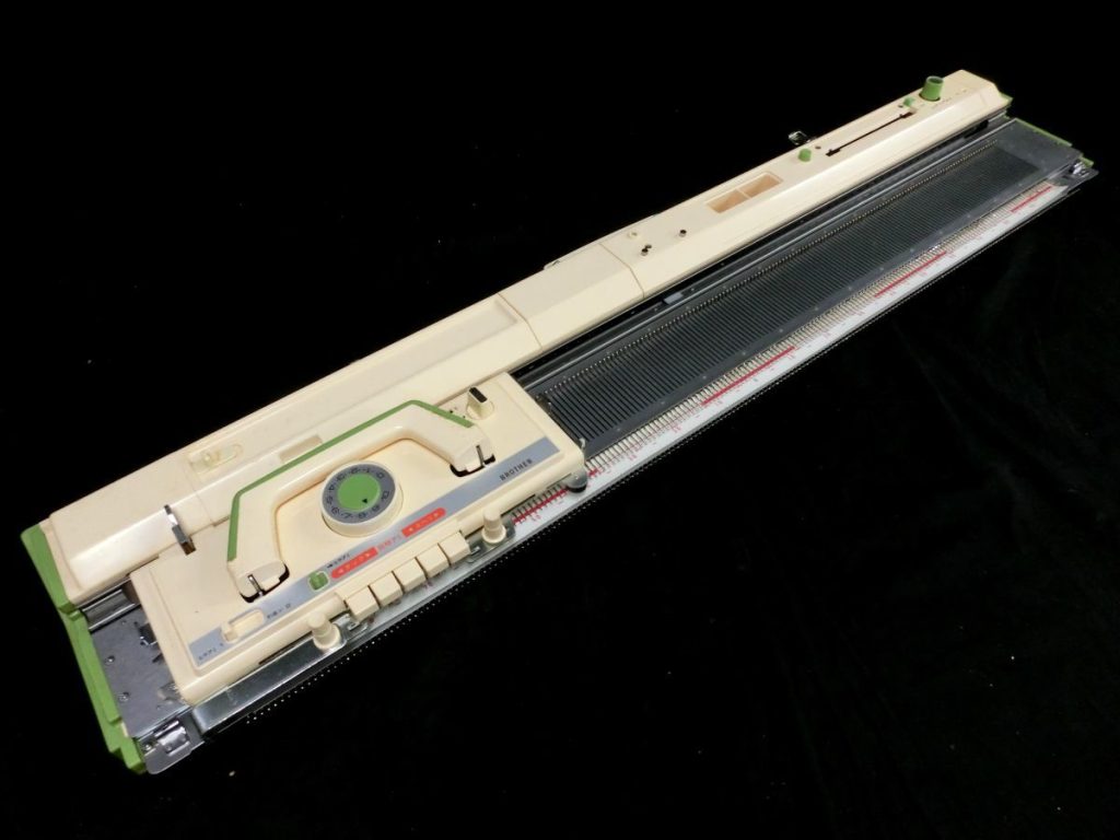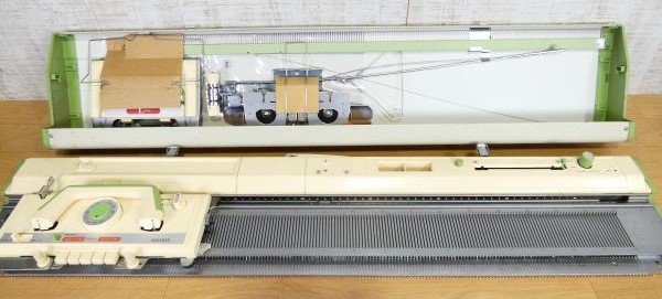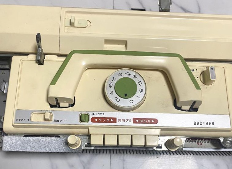 Brother KH821 knitting machine appeared on the market in 1974. It is a standard-gauge (4.5 mm) knitting machine with 200 needles. It is identical to the Brother KH820 knitting machine (thus, refer to that blog post) but probably was available in the Japanese markets (judging by all Japanese writing on the carriage and the panel).