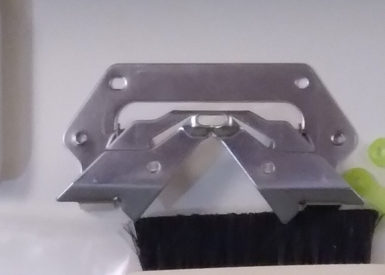 The retaining bar is metal but contains a sponge strip, which needs to be replaced every 6-12 months. The retaining bar with this sponge holds the needles in place. Without the retaining bar, the needles will be too wobbly and will lose stitches. The retaining bar is 0.5 inches wide and 41 inches long. Table clamps are more modern and are simple clamps without any bolt-like screws like more vintage models. Notice that this type of clamp for Brother machines somewhat differs from similar clamps for Singer/Studio/Silver Reed machines: there is no protruding top bracket in Brother knitting machines. Both the top and bottom panels are on the same level.