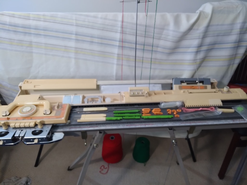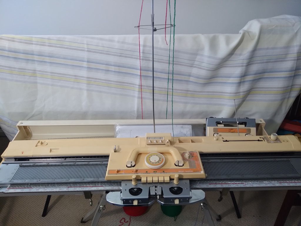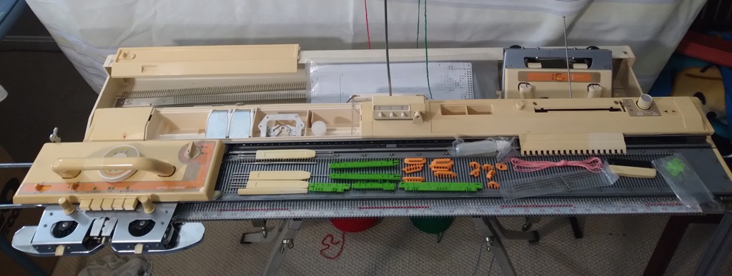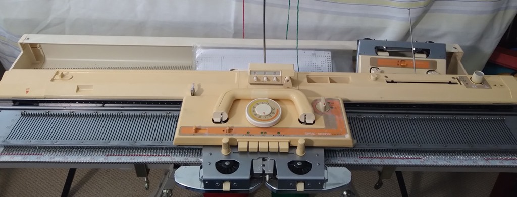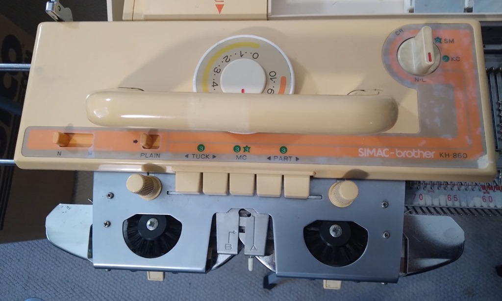 The main knob on the carriage (similar to the Brother KH840 knitting machine) has N-L, KC, SM and CR positions. The patterning capabilities are activated when the knob on the carriage is moved into the KC position and the carriage latches onto a timing belt. A timing belt also helps (if oiled well) to move the carriage more easily across the bed. The handle on the carriage folds when not in use.