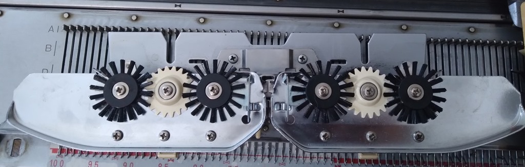 However, Brother KH860 knitting machine is the first one to have an option for the selection of the very last two needles (one on each side) when knitting patterns. This needle selection is adjusted by (de)activating the corresponding cams on the underside of the carriage.