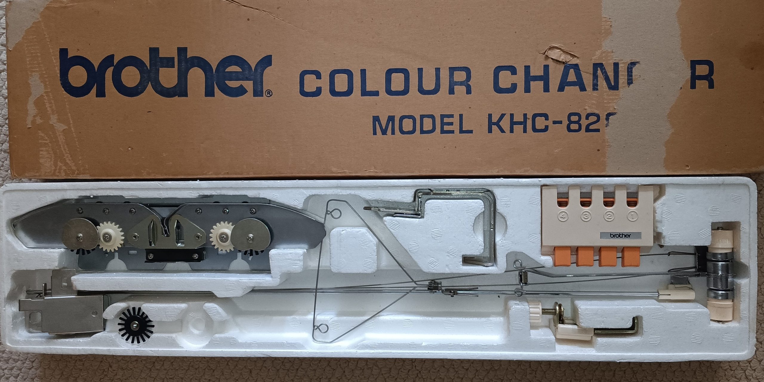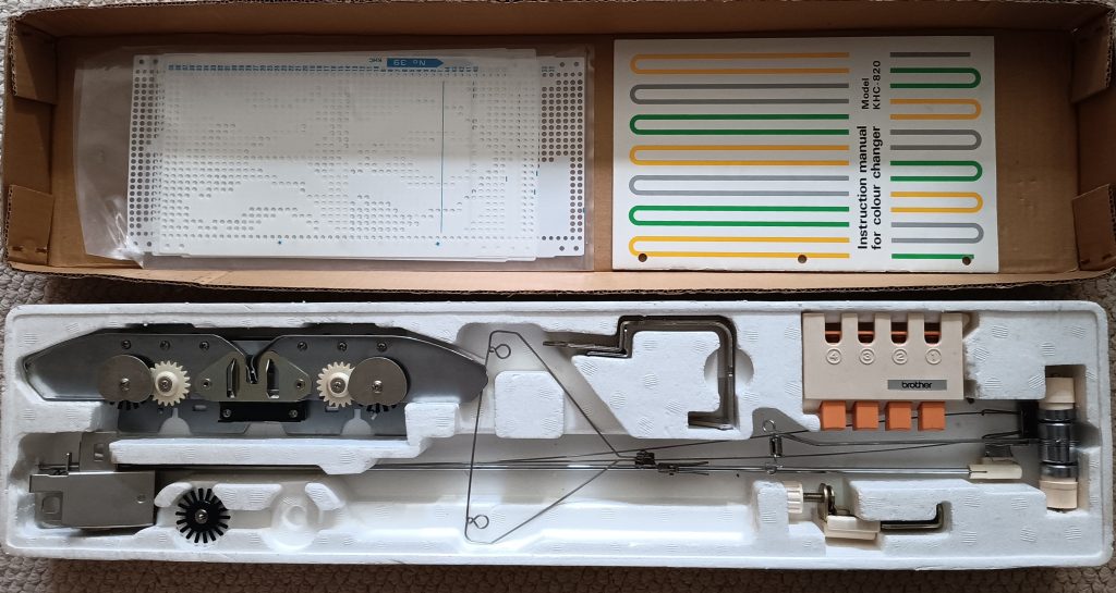 Brother KHC820 color changer is designed to work with single-bed Brother knitting machines. It is compatible with the majority of standad-gauge punchcard and electronic Brother knitting machines. The manual states that it can even be used with Brother KH820 and Brother KH810 punchcard-based knitting machines.