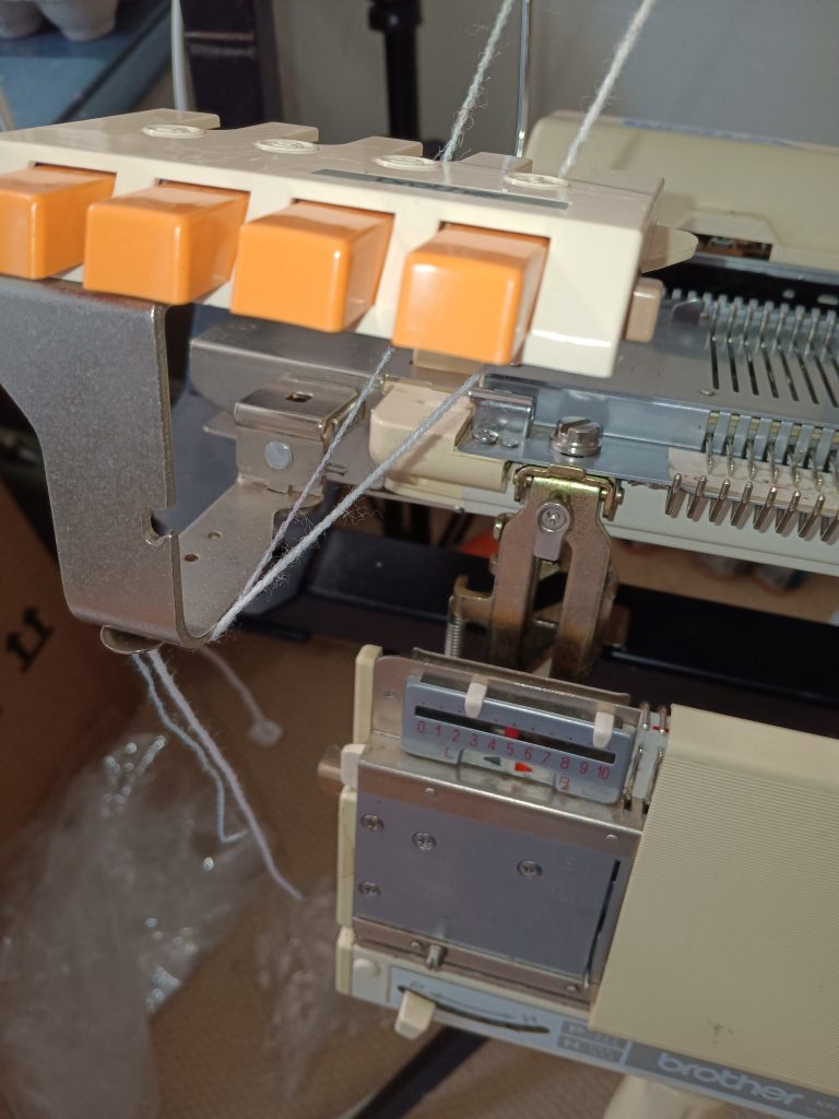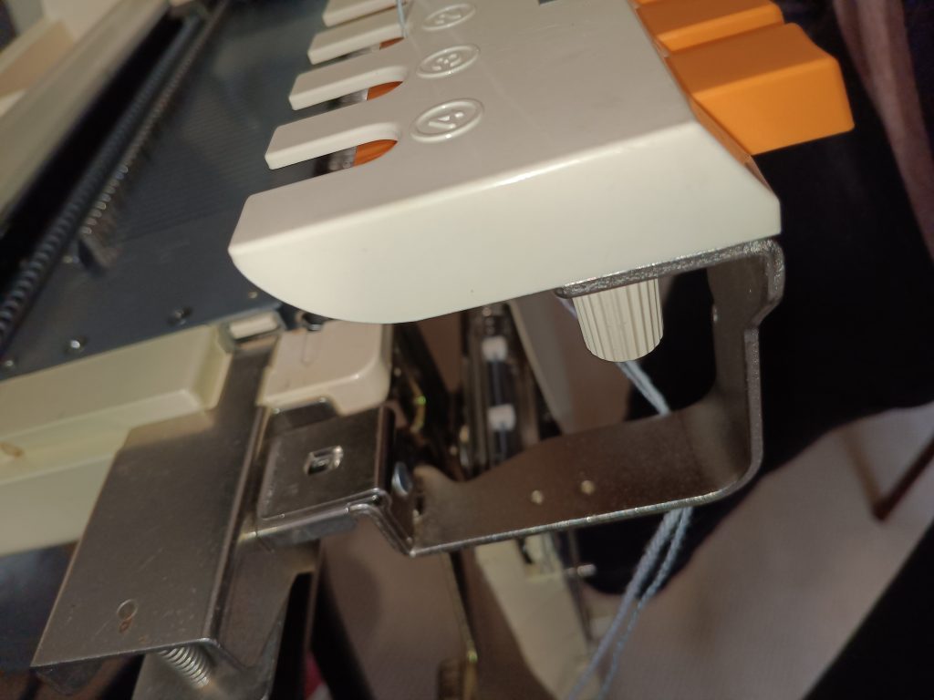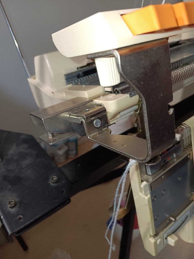 The KHC arm connector acts as a main bed extension. For example, you have a ribber attached to your machine but you still want to use the KHC-820 color changer. Thus, you can use the KHC arm connector by clipping it onto the side of the main bed by securing it into the slot right next to the felt bar (also known as a retaining or sponge bar). Then the yarn change (the one with four buttons) is attached to it. Refer to the manual for specific details.