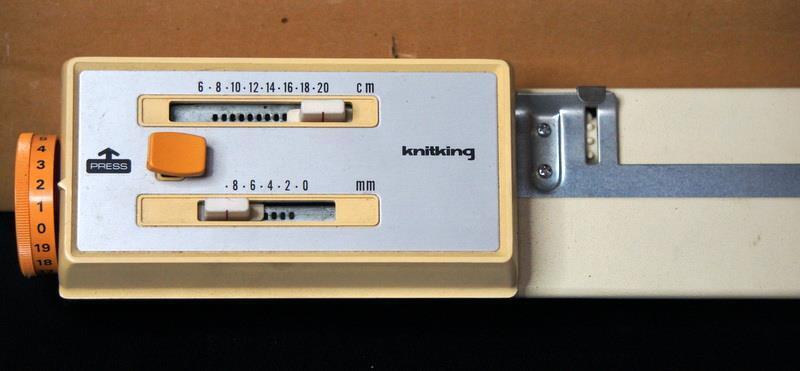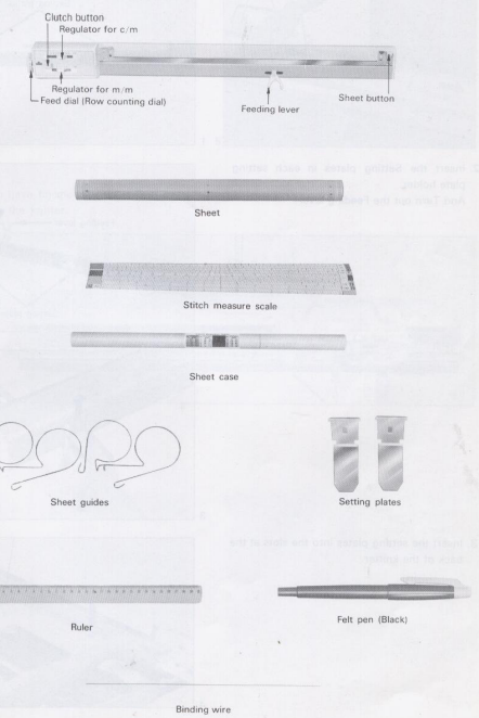 It has similar mylar sheets, which are wider than the sheets for the built-in knit leaders with the zero-line being in the center. The position of the feeding lever is closer to the center and fhisted more to the right-hand side (probably to be closer to the center of the needle bed especially for bulky machines). It also includes a binding wire, not present in earlier knit leader models.