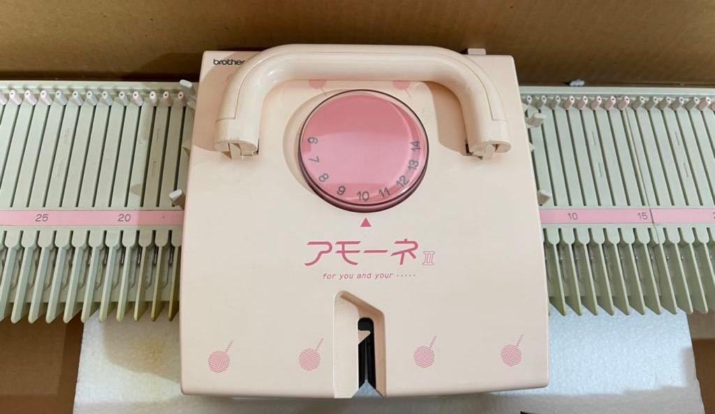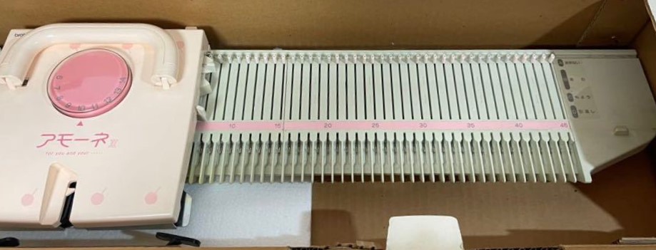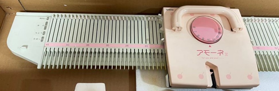 From the pictures, it looks like a mid-gauge knitting machine similar to Brother KX350. It is also very likely that it was made for Japanese markets only judging by the Japanese writing on the carriage, package and needle bed.