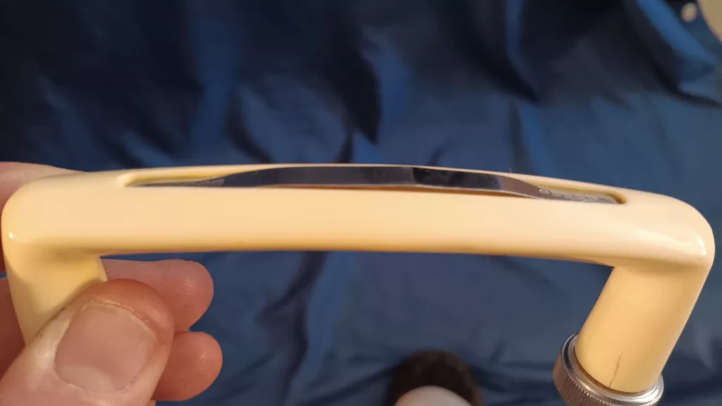 The handle screws onto the carriage, typical for most models of machines and ribbers from the 1950s and 1960s.