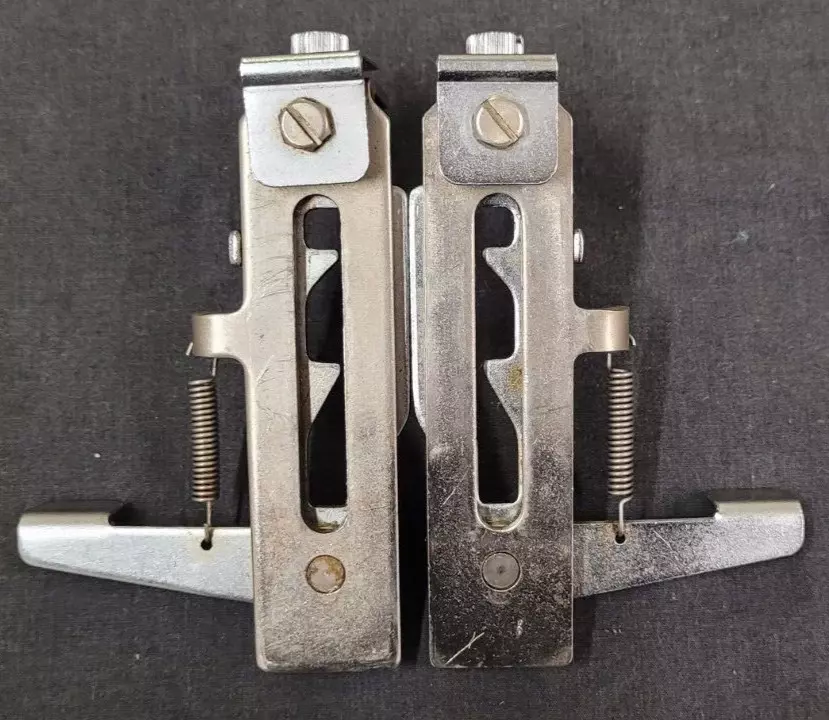 The standard setup also includes reinforcing clamps. They attach to the slot in the side brackets (which would be preinstalled onto the ribber) and then to the table. This way of attachment to the ribber and a table is typical for early model ribbers but is different for later models (the brackets already have a lever that sits on the table and to which the knitter then attaches regular knitting machine table clamps).