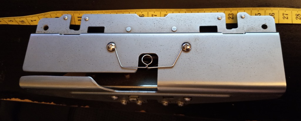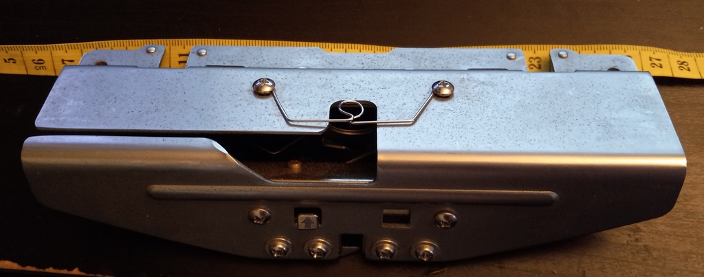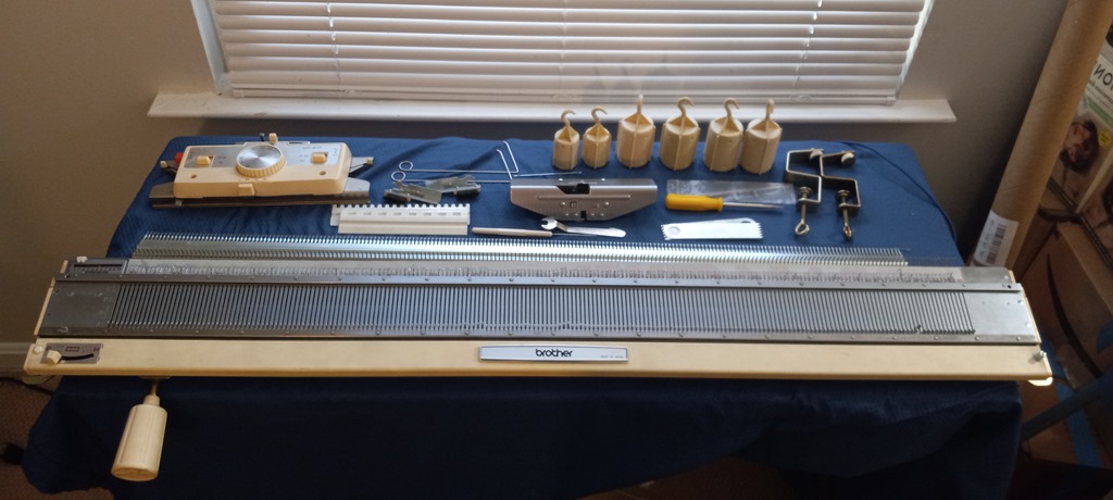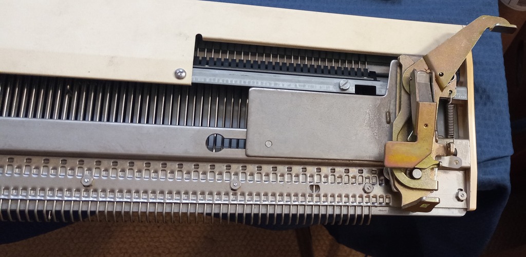 In that configuration, I then attached the ribber to the older narrower machine (Brother KH710) and wider later models (KH970). I was able to knit on the Brother KH970 with that particular Brother KR810 ribber but I was not able to knit on the KR810/KH710 configuration. I suspect that maybe the angle of the KH710 machine and KR810 ribber was a bit off (because I used slightly different reinforcing table clamps and side brackets) and this is why I could not knit. When I find the original side brackets, I will retest KR810 on push-button models to make sure the Internet sources are not mistaken that Brother KR810 ribber can knit on narrower older models like KH552, KH710 and KR800.
