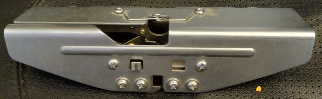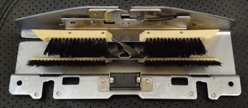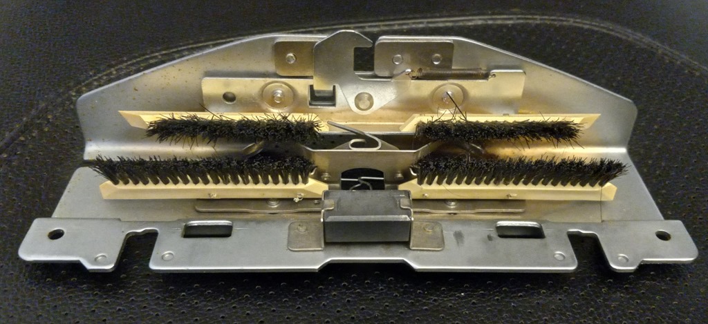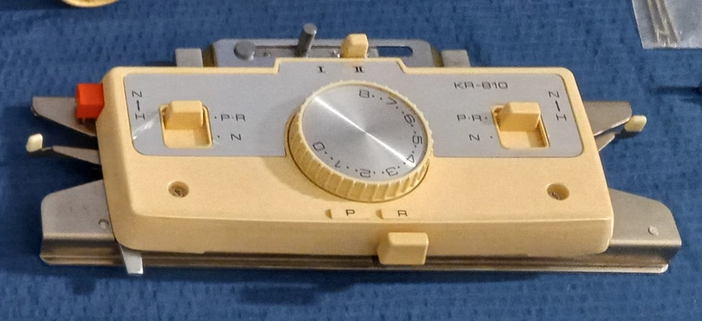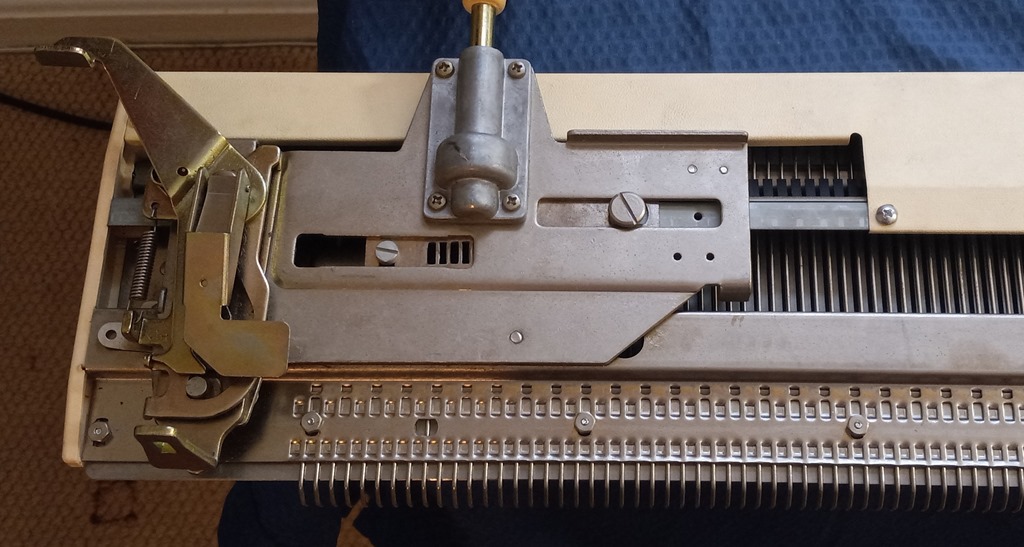 The carriage also has all the usual settings, although their positions is a bit different than on the carriages for the later models, like Brother KR830 and KR850. For example, the I-II lever for the KR810 carriage is on the top of the carriage but for the later KR830 and KR850 models, this lever is at the bottom of the carriage. The position of the Pr-R lever is reversed as well: it is at the bottom of the KR810 carriage and it is a side-to-side lever, while on KR830/KR850 it is an up-down lever and it is at the top-side of the carriage. Additionally, unlike any other ribber carriages I have had experience dealing with so far, the carriage for the KR810 has a release button (red button on the top left-hand side of the carriage). This button helps to easily position and remove the carriage onto the bed. When I worked with this ribber (which is described in a separate blog article), I actually liked the presence of this button quite a lot. It was very convenient to move/remove the carriage during the knitting or simply from the middle of the bed.