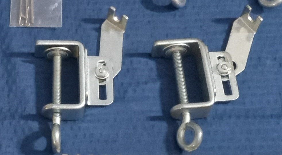 The standard setup also includes reinforcing clamps. They attach to the slot in the side brackets (which would be preinstalled onto the ribber) and then to the table. This way of attachment to the ribber and a table is typical for early model ribbers but is different for later models (the brackets already have a lever that sits on the table and to which the knitter then attaches regular knitting machine table clamps).