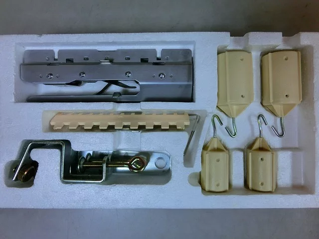 Typical assesories that the ribber comes with are the ribber carriage, left and right brackets, racking grip handle, connecting arm, end-stitch pressure (right and left), table clamps, long and short cast-on combs, large and small barrel weights, wire-loop type weight hangers (to attach on the end of the knitted panels), fine-knitting bar (a long plastic thin bar to knit with finer yarns), claw weight hangers (to attach to the knitted fabric anywhere on the panel), spanner (acts like a screwdriver and a wrench to adjust the distance between the ribber and the main beds), work hook, spare needles with the case, transfer needle (like a double-eye needle) and a 1/2 and 2/2 needle pusher.