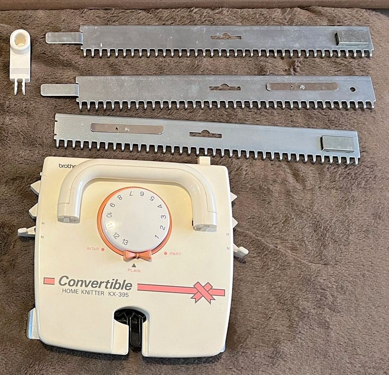 Do not confuse this model with the Brother KH395 knitting machine, although they are very similar: both are convertible and plastic flatbeds. The only difference I can see so far is their look. The rest I am still figuring out, since I can’t find a manual for KH395 🙂 ). Maybe the only difference is that KX395 was made for Western markets and KH395 for Japanese ones (judging by the all-Japanese writing on the carriage and needlebed of KH395).