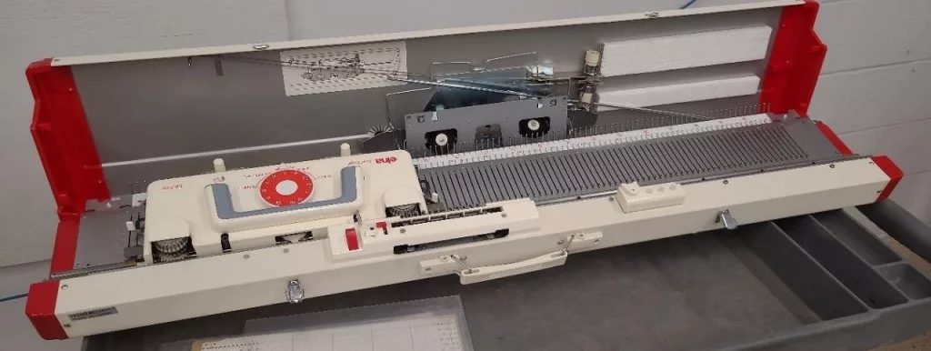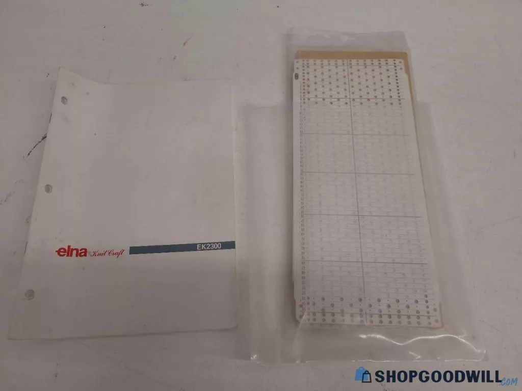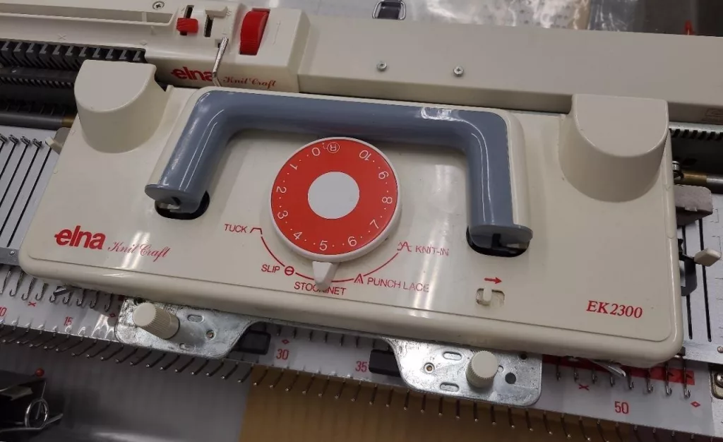 Elna EK2300 is a bulky gauge (9 mm) knitting machine with 110 needles and 12-stitch repeat punchcard reading capabilities.