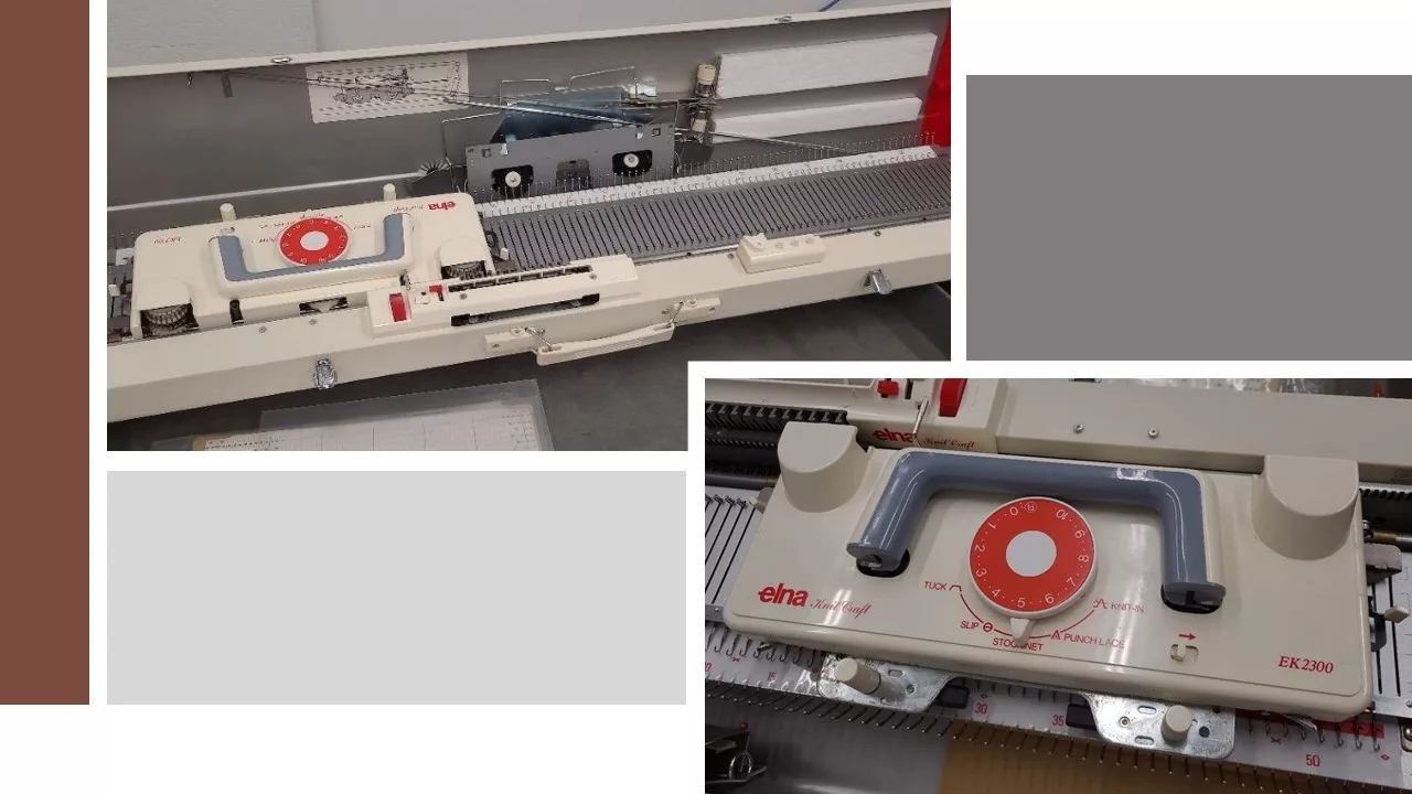 Elna EK2300 is a bulky gauge (9 mm) knitting machine with 110 needles and 12-stitch repeat punchcard reading capabilities.