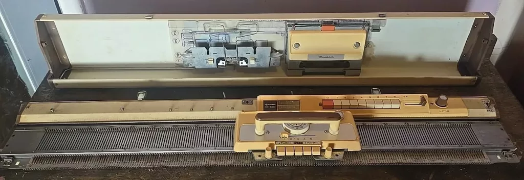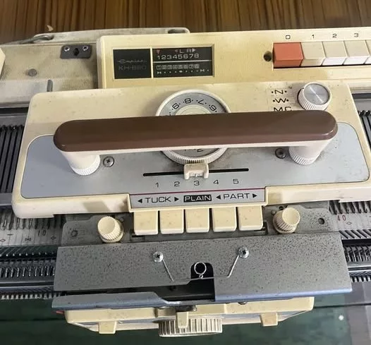 It is also similar (even in the color combo) to Brother KH710 and Brother KH705, except KH710 and KH705 have foldable carriage handles. Other similar machines with a more advanced patterned center (they have N/MC lever on the right-hand side) are Brother KH587, Brother KH588, and Brother KH601.