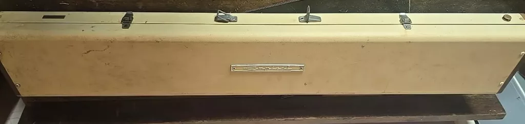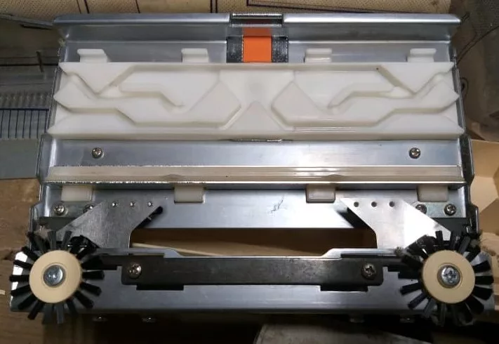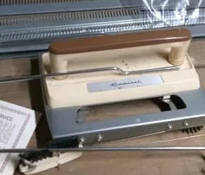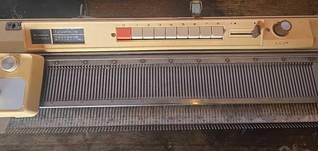 Empisal KH680 knitting machine features 200 needles, 4.5 mm apart. Thus standard-gauge machine has a patterning center with eight pushbuttons to allow for semi-automatic needle selection.