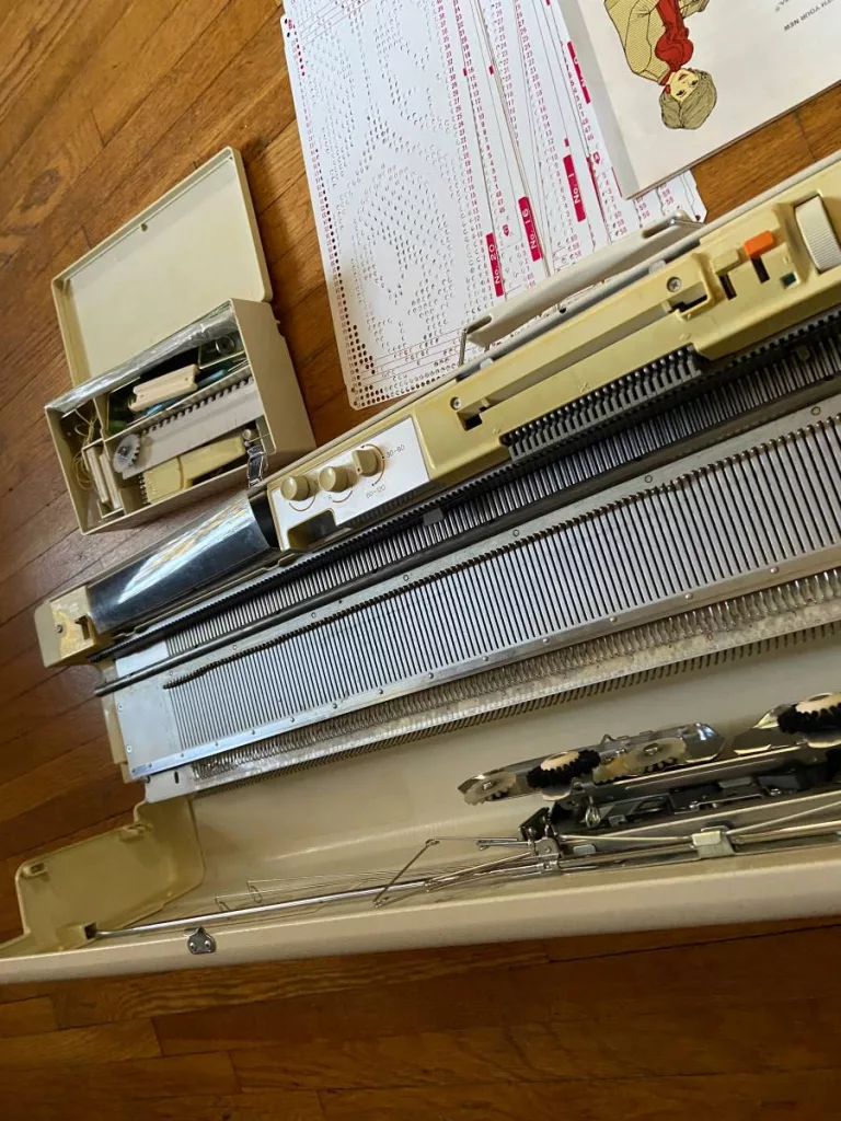 It has a built-in knit leader and punchcard reading mechanism for creating patterned textile fabrics.