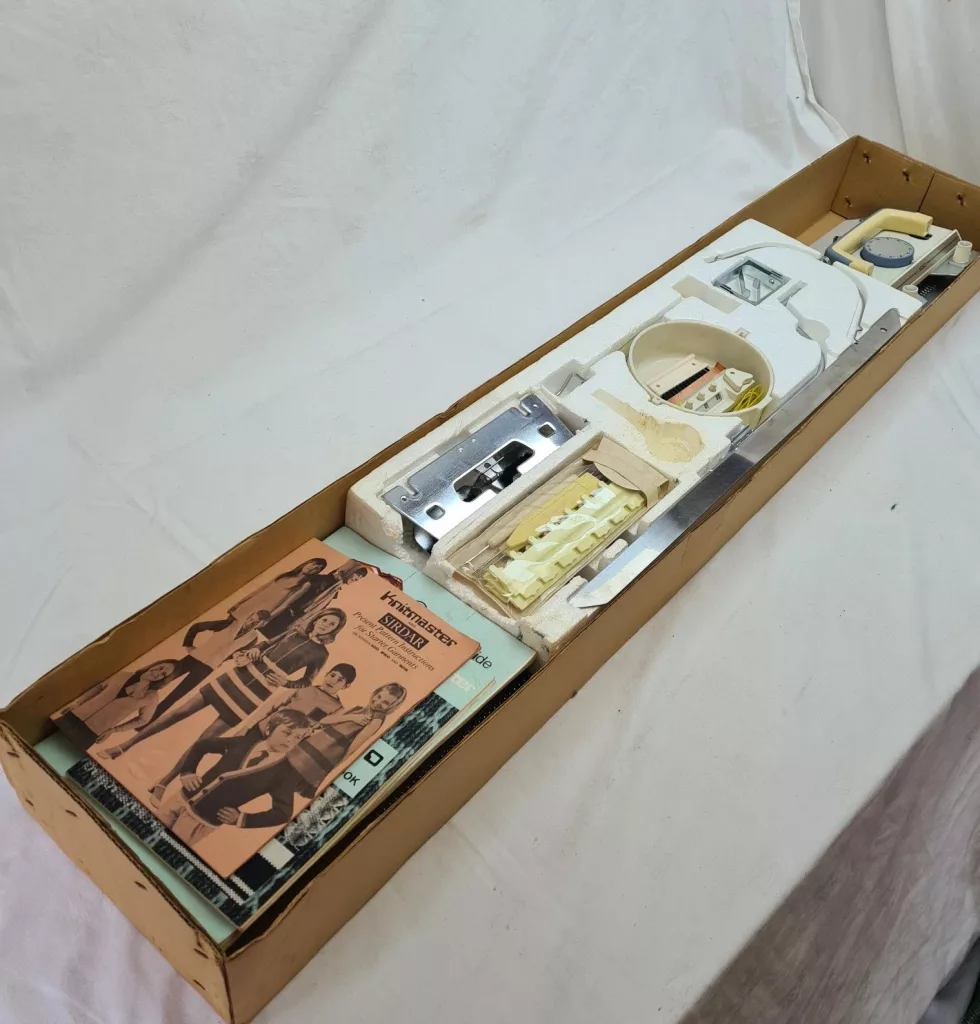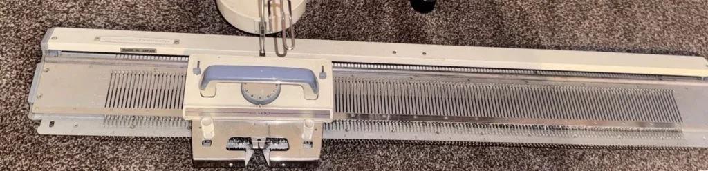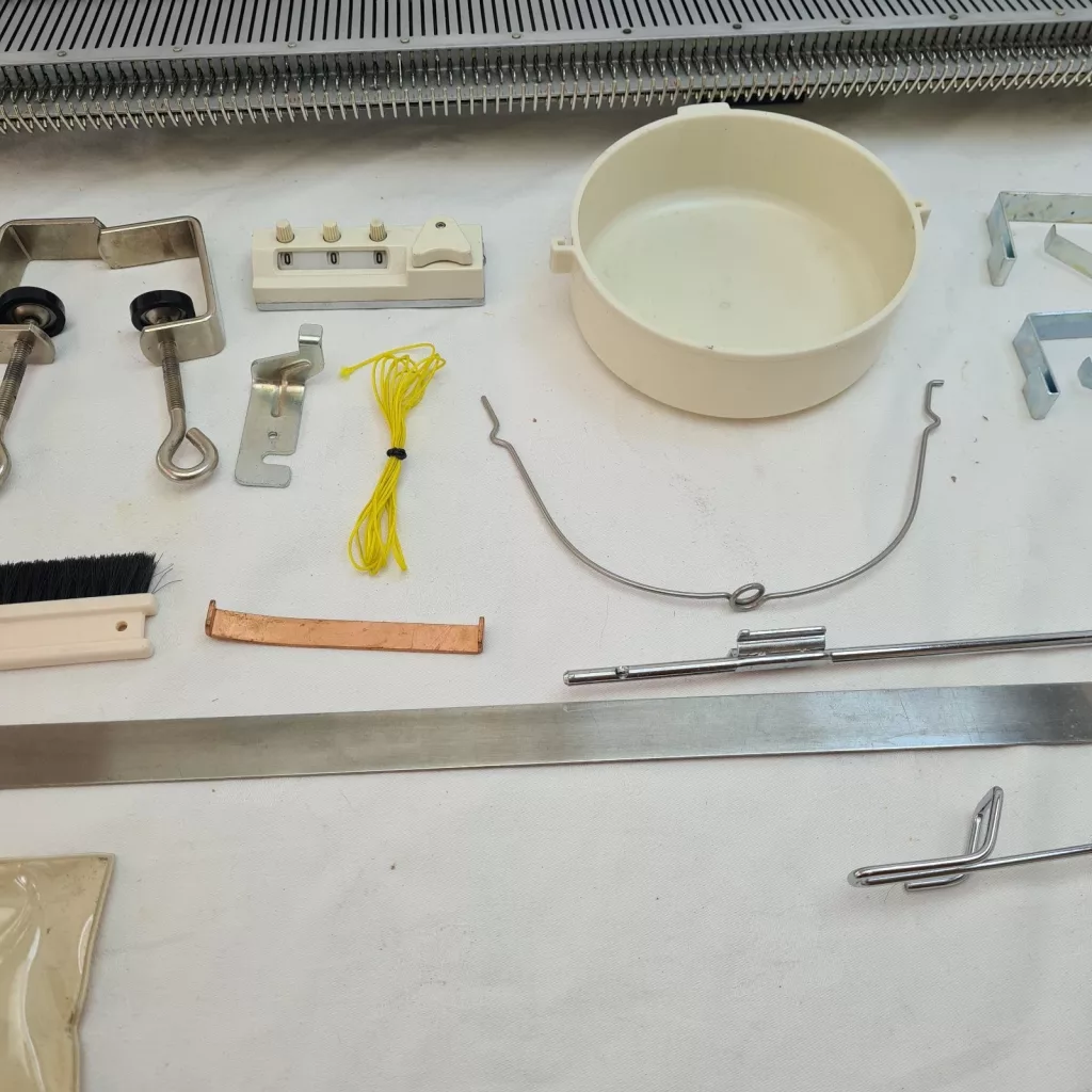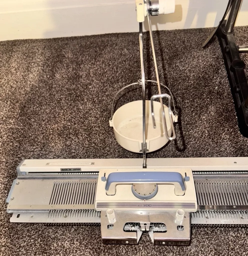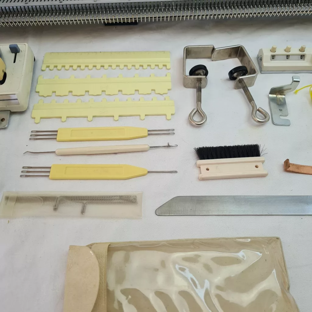 The tension mast has a unique setup too: it has a yarn holder attached to it. Another machine with such a tension-mast setup is Empisal Knitmaster mod. 250. Despite a lot of unusual and vintage features, it still has a more modern row counter.