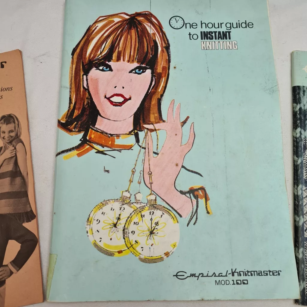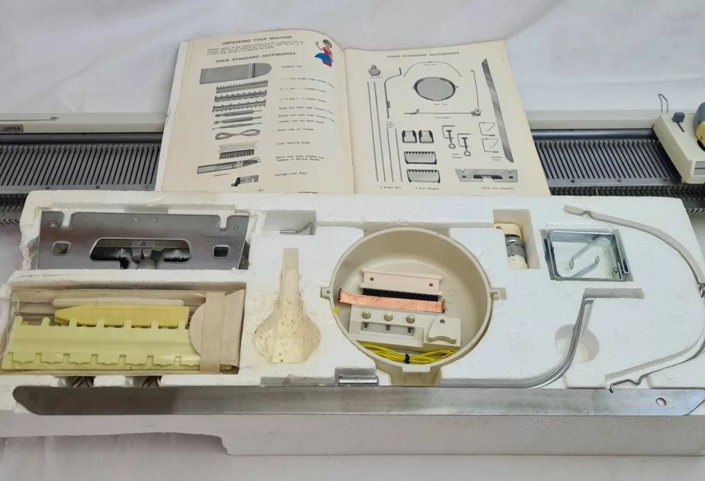 Empisal Knitmaster mod. 100 knitting machine is a standard-gauge machine with 200 needles, 4.5 mm apart. It is capable of only manual needle manipulation so it can knit only basic stitches.