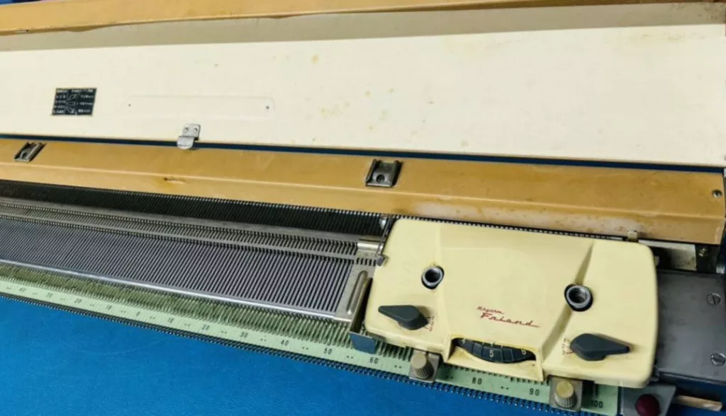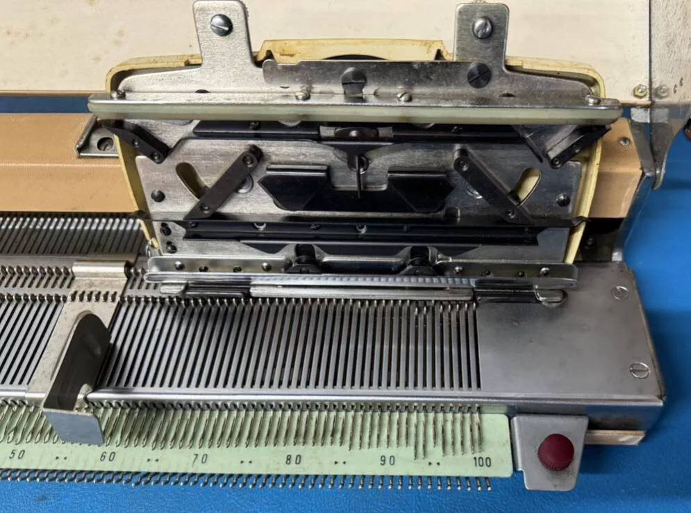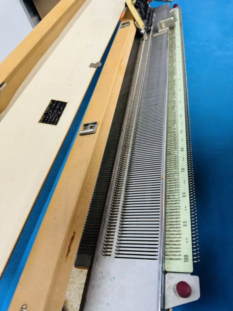 Beautiful, truly vintage-look, olive-green colored knitting machine. Judging by the look it is standard-gauge. Typical vintage features are super-sturdy case, (un)foldable bed-extension plates, and a funky-looking carriage with what-looks like a pressure gauge LOL. Another interesting feature that I observe at all other three models below: a top row of needle buds. Not sure why and how but they look very similar to the sinker hooks present in Brother KH210 and Corona knitting machines. So stay tuned for more info!