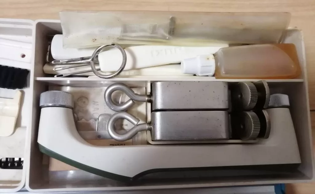 All other features are still vintage: screw-on carriage handle and S-shaped table clamps.