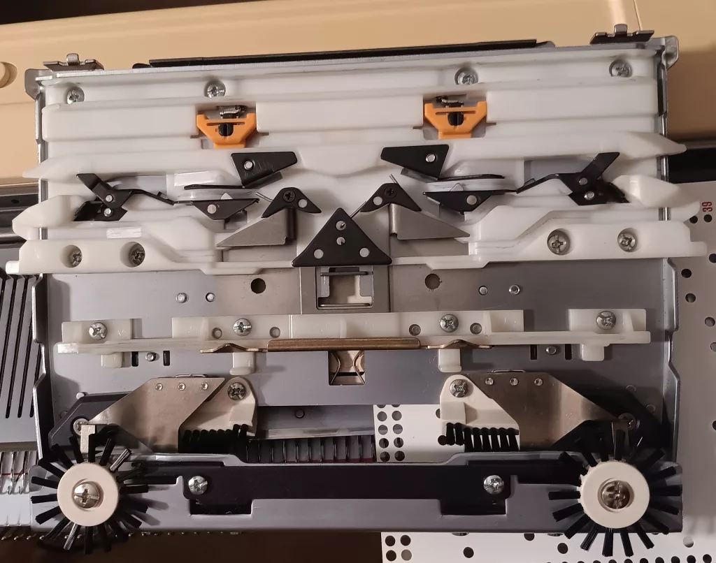 This carriage is more complex than the lace carriages for its older sisters, punchcard machines.