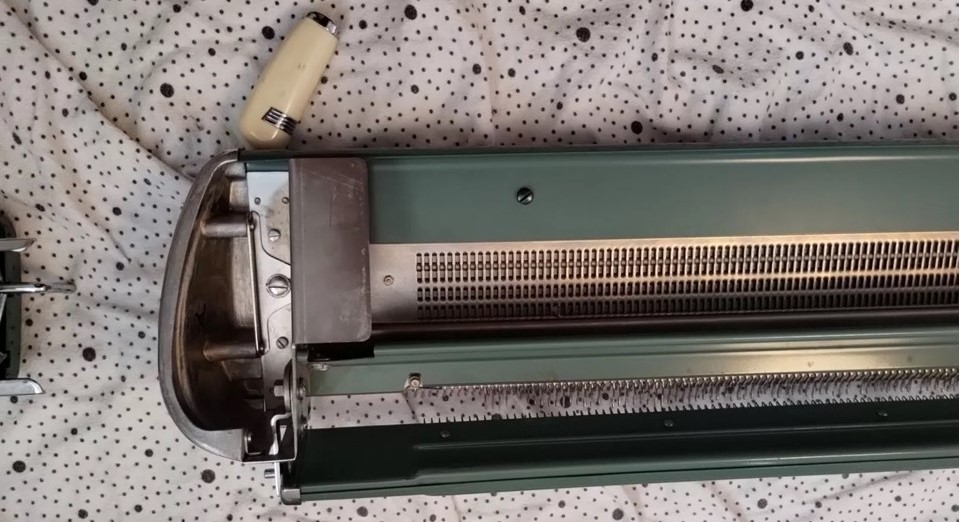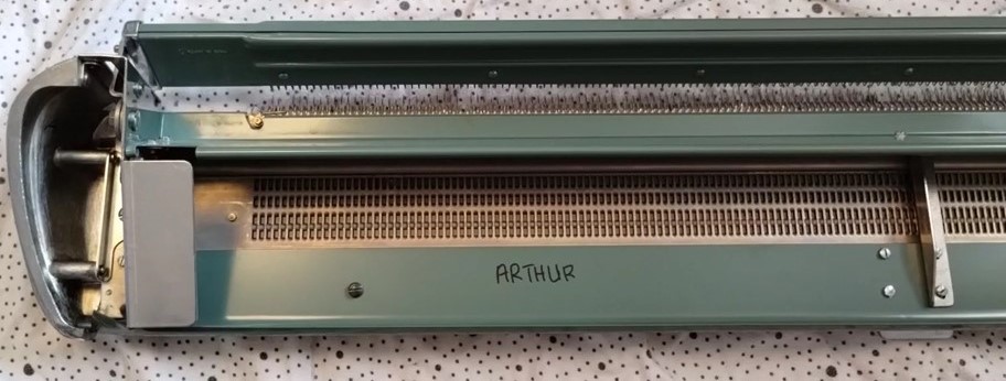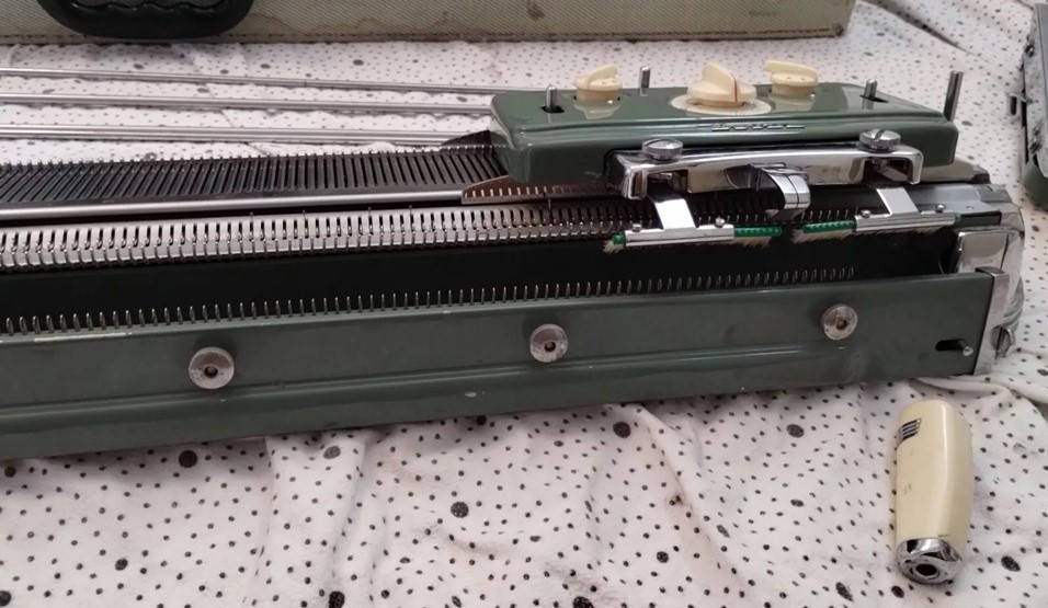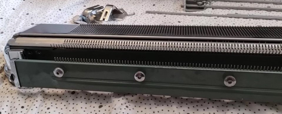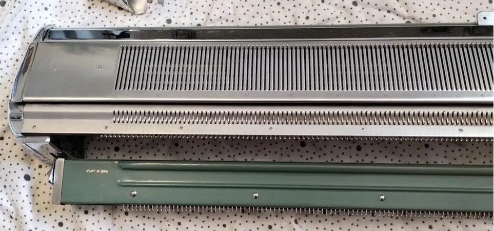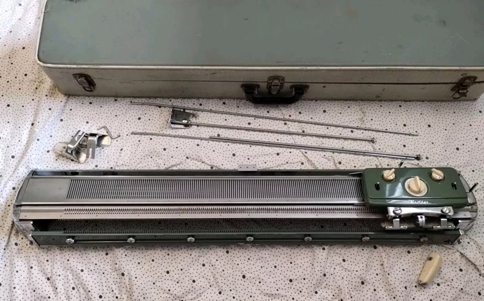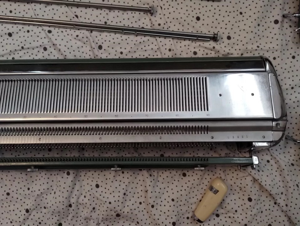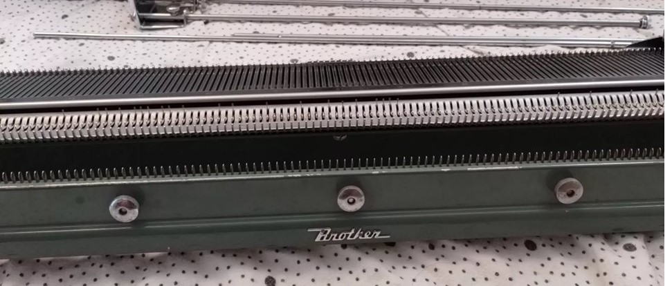 The pictures show a Brother KH212 knitting machine attached to a KR212 ribber.