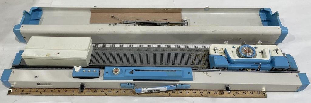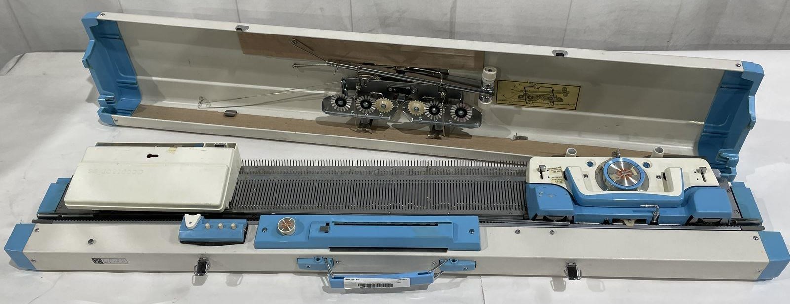 The machine has typical features of early Silver/Silver Reed punchcard-capable knitting machines: a detachable row counter, and a stand-alone toolbox.