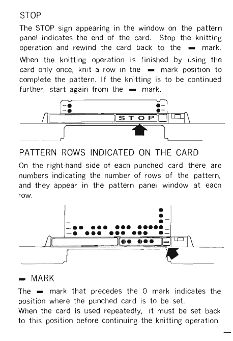 This machine has an interesting feature: when you knit for a while, and the pattern on the card is finished, a STOP word will appear on the display of the punchcard reader. This STOP word is actually from the punchcard itself. Thus, punchcards for this machine are very easy to distinguish by this giant STOP lettering.
