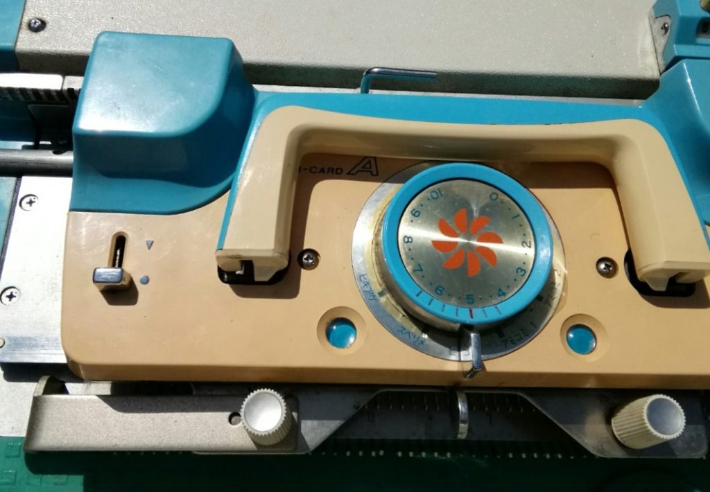 Note that this model still has only one lever on the pattern panel (lever with a silver cap in the picture above): only to release the punchcard so it advances when the machine knits patterns and is passed back and forth. Later models have two levers: one for card release and one to expand the pattern vertically by a factor of two.