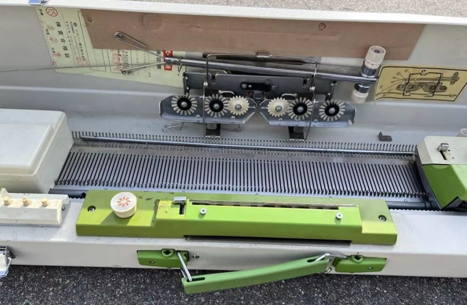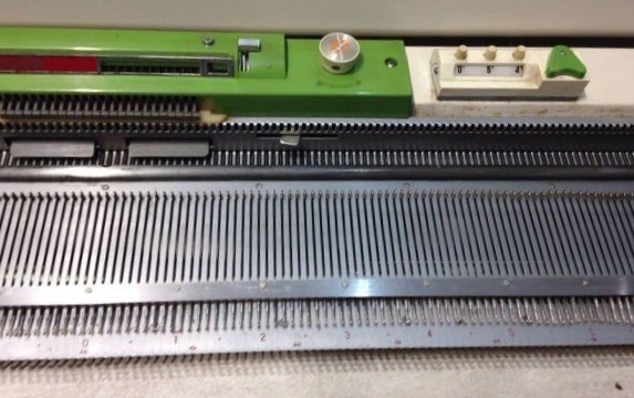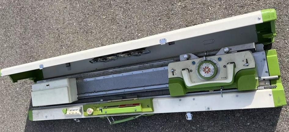 This machine has punch-card reading capabilities to automatically select needles and create patterned knitted fabric.