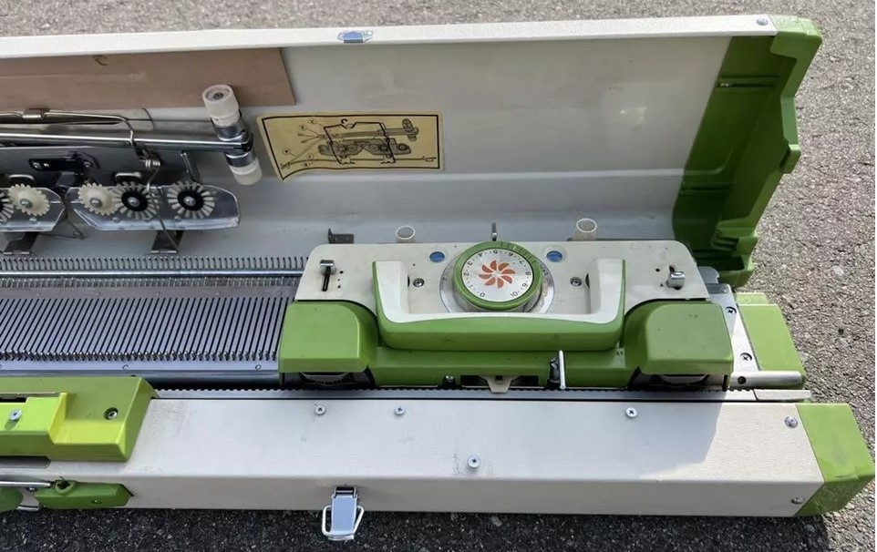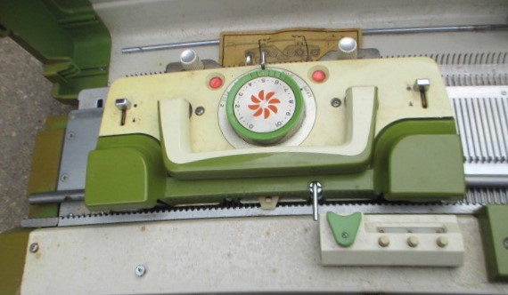 Note that this model still has only one lever on the pattern panel: only to release the punchcard so it advances when the machine knits patterns and is passed back and forth. Later models have two levers: one for card release and one to expand the pattern vertically by a factor of two.