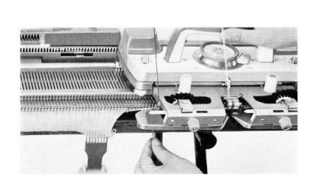 The machine can have a two-color fair isle knitted simultaneously (the manual calls it “knit-in”). However, only the main yarn is threaded through the yarn feeder. The second yarn (the contrasting one) is hooked on the yarn holder. I’ve seen a similar 2-color knitting technique on the vintage (pushbutton and first punchcard) Brother machines. On Silver SK311, you will also need knit-in brushes. This technique is a bit similar to weaving (although positions for the weaving and knit-in brushes are different). Both techniques are described in the manual pretty well.
