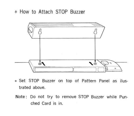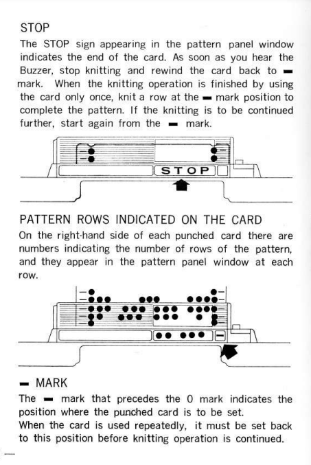 All these machines have an interesting feature: when you knit for a while, and the pattern on the card is finished, a STOP word will appear on the display of the punchcard reader. This STOP word is actually from the punch card itself. Thus, punchcards for this machine are very easy to distinguish by this giant STOP lettering.