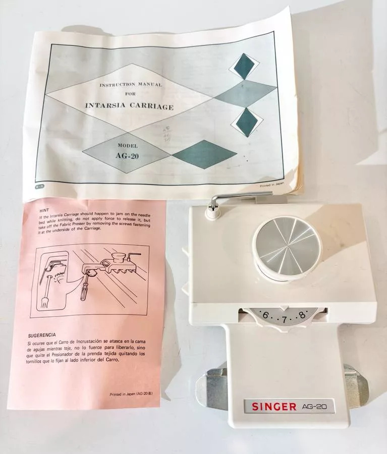 Singer AG20 intarsia carriage fits almost all standard-gauge knitting machines manufactured under the Silver/Silver Reed/Empisal Knitmaster/Singer/Studio/RICCAR names (except for the turn-knob ones) and several of first generation punchcard machines. It even fits some fine-gauge machines but with some modifications (the step-wheel/gear needs to be replaced).
