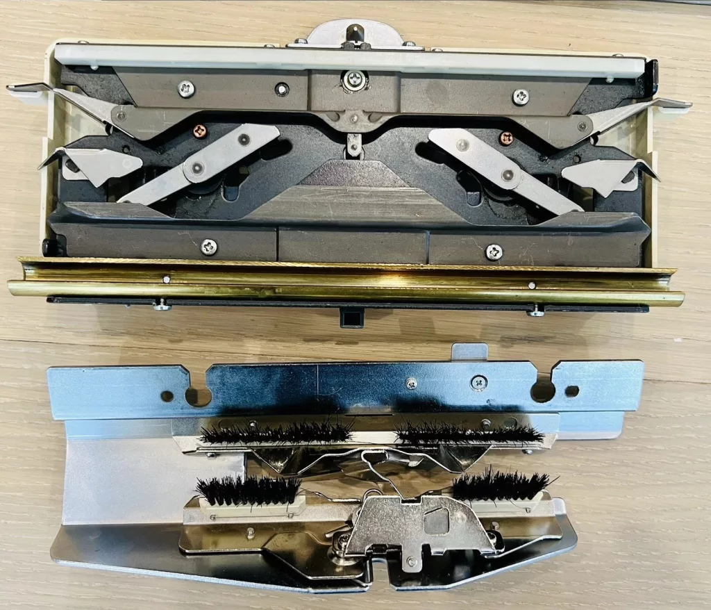 • when knitting on the full bed (all needles), especially when the ribber is dropped out of the way and you are knitting with a regular sinker plate), the sinker plate wheels catch a bit on the setting plates. SOLUTION: knit on all needles it only necessarily. When knitting not on all needles, do not move the carriage too far, pass the setting plates.
