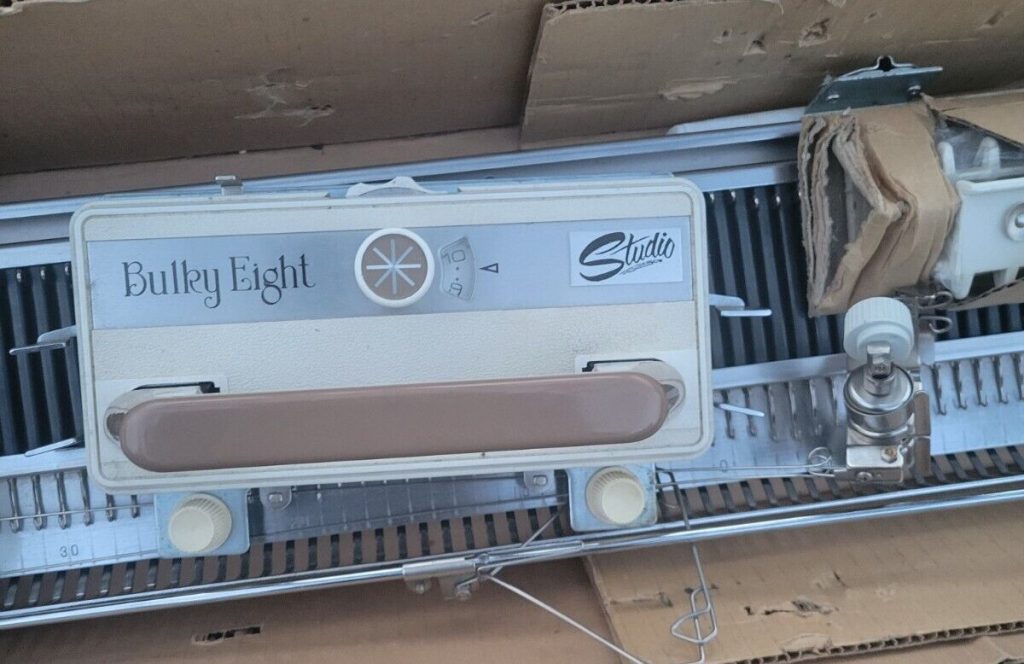 Studio SK120 knitting machine is a flat-bed metal knitting machine with 120 needles 8.0 mm apart. This bulky-gauge knitting machine was released to the market in 1978. It is also known as Bulky Eight (or ‘Studio Bulky Eight”, Kantan Bulky, and Silver SK120. This machine is identical (except for the name) to the Silver Reed SK120 knitting machine. Thus, read the main post for additional details.