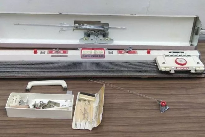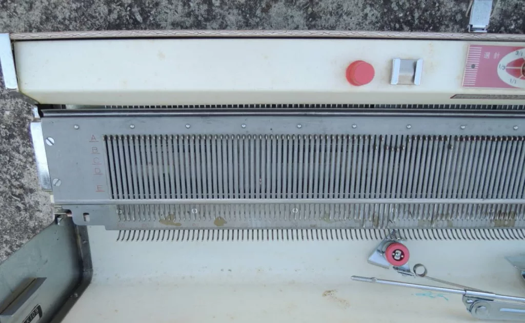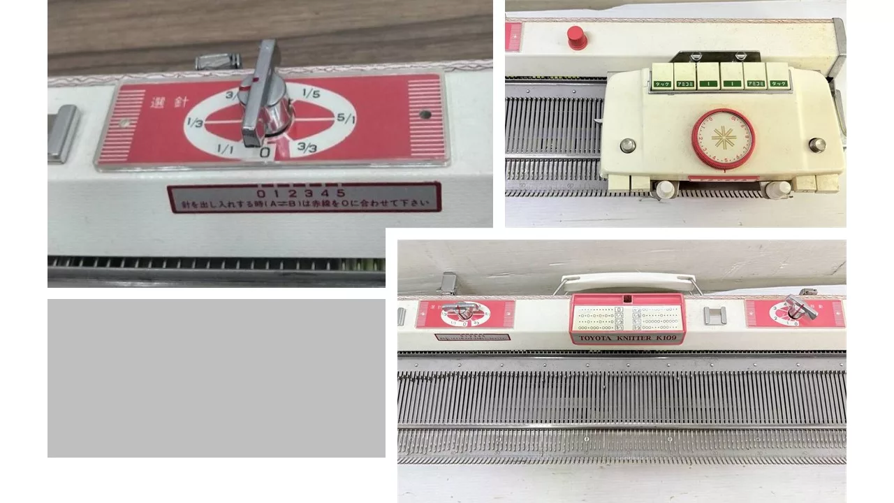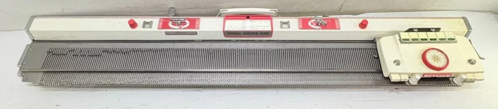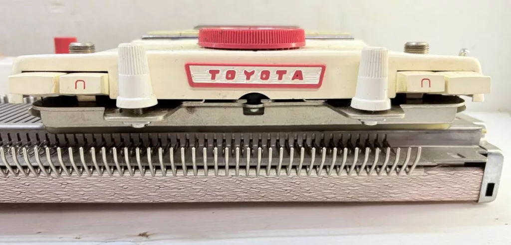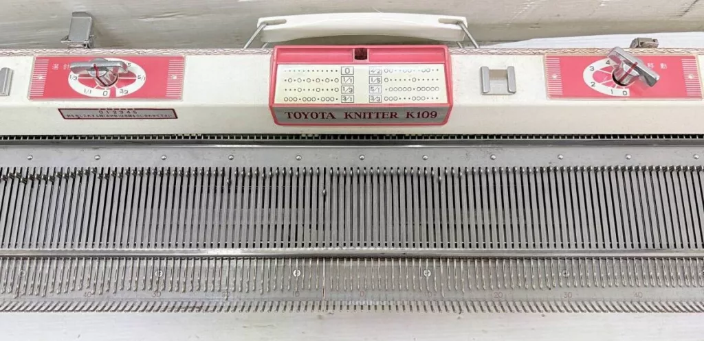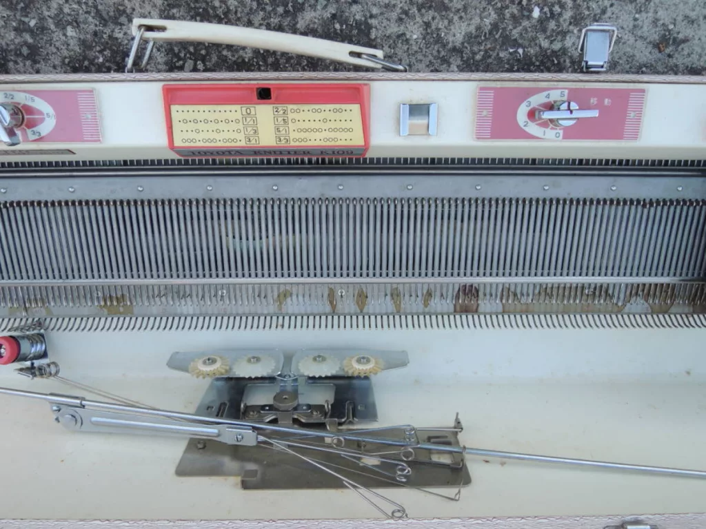 This pretty pink and white knitting machine is Toyota K 109. It is a standard gauge knitting machine with 200 needles, 4.5 mm apart from each other. This is the first “advanced” model manufactured by Toyota. All previous models (K104, K106, K107 and K108) have only manual needle manipulation capabilities.