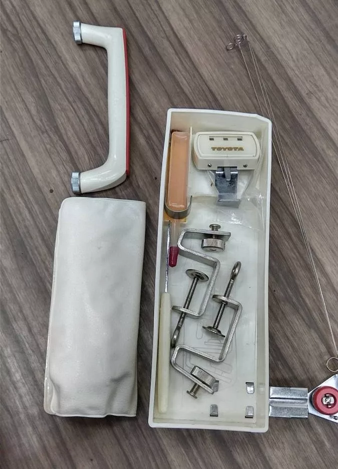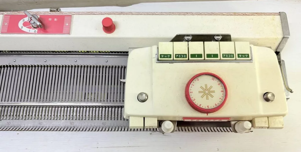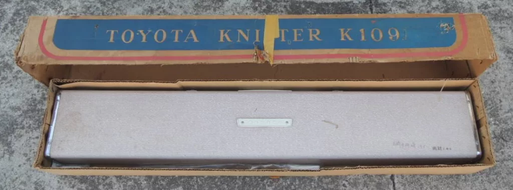 All Japanese writing on the machine and the carriage suggest that this model was released for the Japanese markets only. Typical for the knitting machine of that time, the carriage handle is screw-on and is stored in the toolbox when not in use. A very distinct feature of this carriage is the button on the upper side of the carriage: on other main stream knitting machines (Brother and Silver/Reed/Studio), the buttons or the selection dial are on the lower side of the carriage.