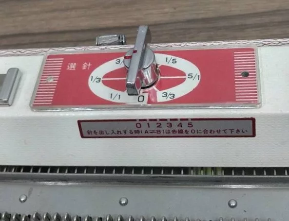 The patterning mechanism (as well as needle selection) are performed by the two turn knobs on the machine’s dashboard. The numbers on each turn knob indicate which needles will be selected. For example, in the picture below, “1/3”