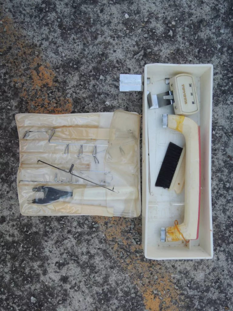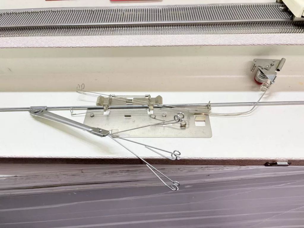 I see that the tool contains a ratchet tool. In Brother pushbutton machines, the ratchet tool is used to activate the needle selection and bring the needles forward. However, the pictures above and below do not indicate where the ratchet tool will go to. So, it is likely that the needle are moved forward by the carriage like in Silver/Studio/Singer turn-knob knitting machines.